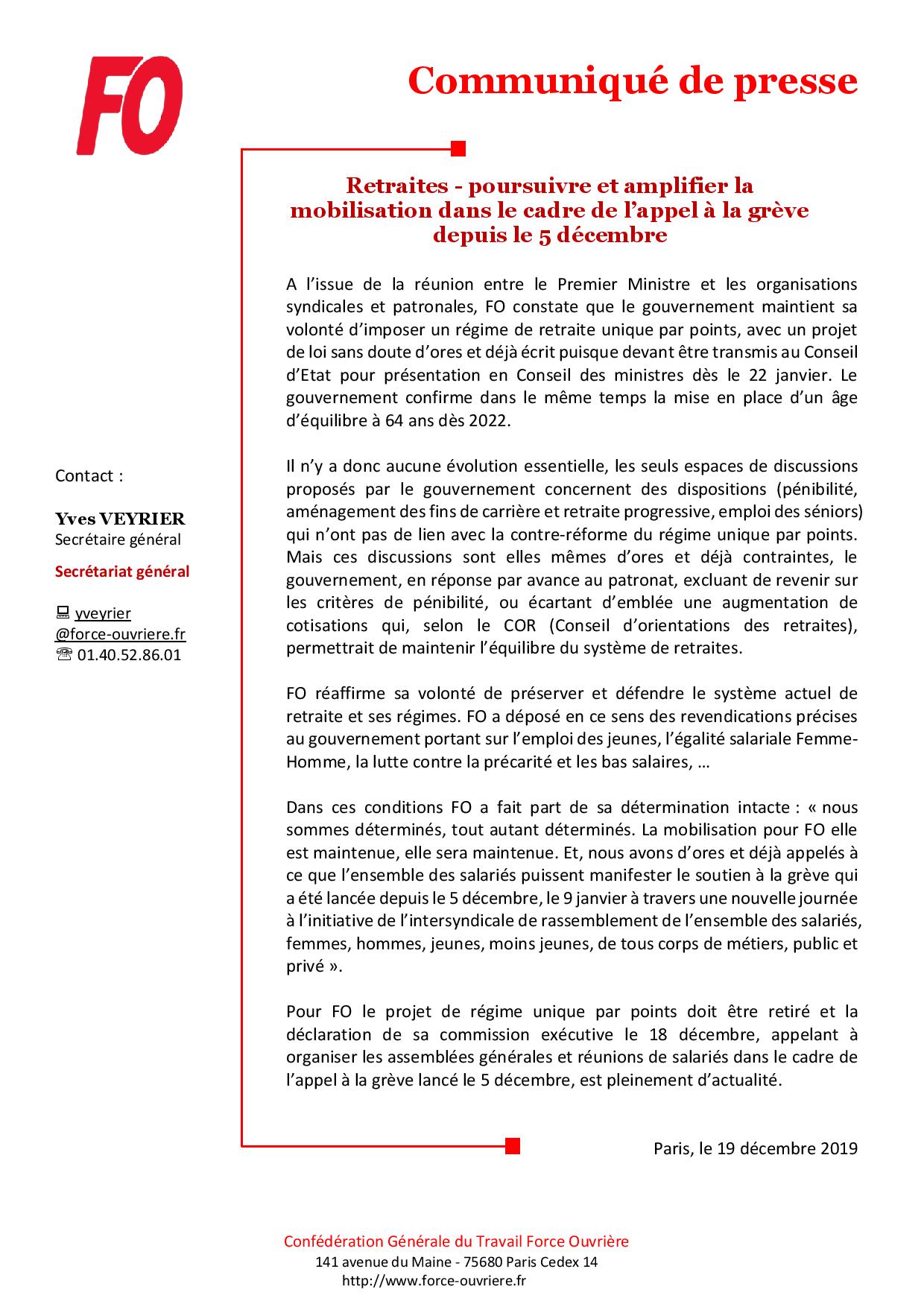 Dans ces conditions FO a fait part de sa détermination intacte : « nous sommes déterminés, tout autant déterminés. La mobilisation pour FO elle est maintenue, elle sera maintenue. Et, nous avons d’ores et déjà appelés à ce que l’ensemble des salariés puissent manifester le soutien à la grève qui a été lancée depuis le 5 décembre, le 9 janvier à travers une nouvelle journée à l’initiative de l’intersyndicale de rassemblement de l’ensemble des salariés, femmes, hommes, jeunes, moins jeunes, de tous corps de métiers, public et privé ».